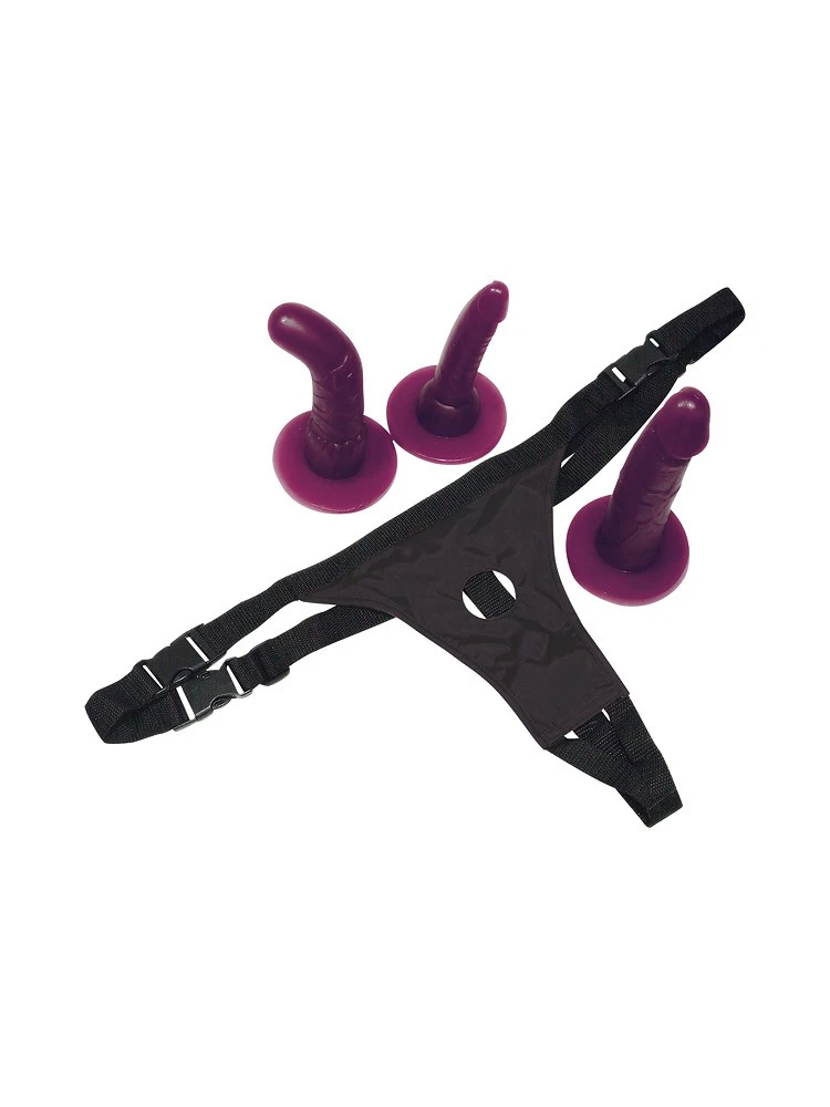 Böse, geile Miezekatzen mögen geile Rollentausch-Spiele! Egal, auf welcher Seite du dich befindest – lustvoll wird dieser Rollentausch auf jeden Fall. Drei verschiedene, massive Dildos können in der Öffnung des Ouvert-Strings angebracht werden und bereiten dir oder deinem Gegenüber unvergessliche Wonnen, wenn die starke Äderung und die ausgeformte Eichel die Lustgrotte erobern. Der Umschnallslip ist mit breiten, größenverstellbaren Nylonbändern ausgestattet und paßt so kleinen und großen Miezekatzen (S-XL). Die lilafarbenen Freudenspender sind wie folgt bestückt: der Naturpenis ist 18cm lang bei Ø von 2,9 bis 4cm, der schmale Analexperte ist 17cm lang bei Ø 1,9 bis 2,9cm und der anatomisch perfekt gekrümmte G-Punkt-Reizer ist 17cm lang bei Ø 2,7 bis 4,2cm. Alle drei Dildos bestehen aus TPE, der String ist aus Polyamid gefertigt.